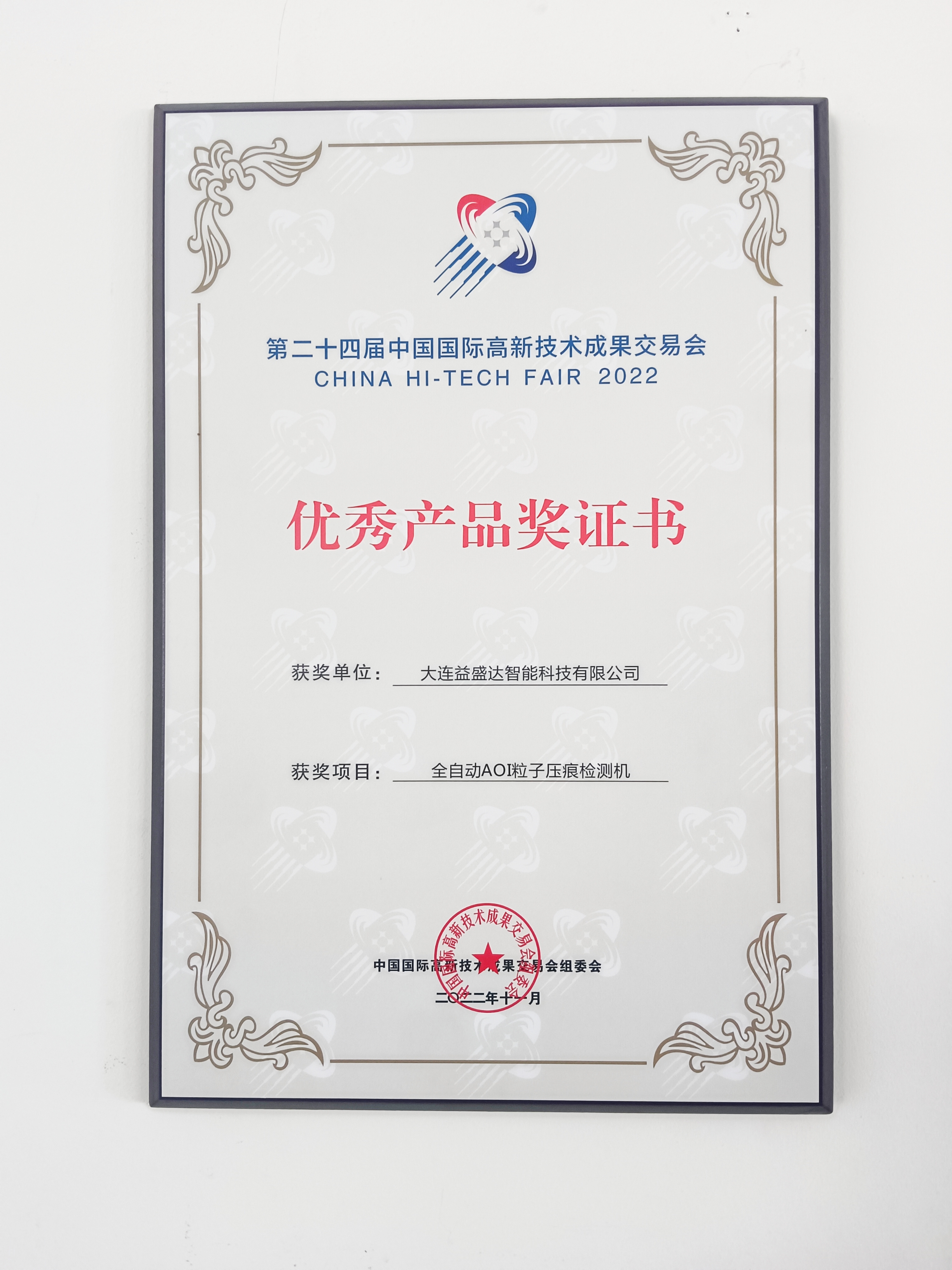 在剛剛落下帷幕的“第二十四屆中國國際高新技術(shù)成果交易會”(以下簡稱國際高交會),大連益盛達智能科技有限公司(以下簡稱“益盛達公司”)的全自動AOI粒子壓痕檢測機,憑借先進的檢測功能,榮獲“優(yōu) 秀 產(chǎn) 品 獎”。